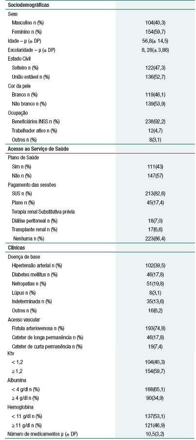 As principais características sociodemográficas, clínicas e de acesso aos serviços de saúde dos 258 indivíduos entrevistados estão apresentadas na tabela 1. Destaca-se na amostra que: 59,7% dos participantes eram do sexo feminino; 53,9% tinham cor da pele não branca; escolaridade média de 8,28 (dp= 3,86) anos. Dos participantes, 92,2% eram beneficiários da seguridade social, apenas 4,7% dos indivíduos estavam ativos no mercado de trabalho durante a coleta de dados.