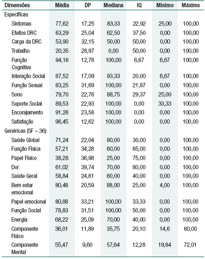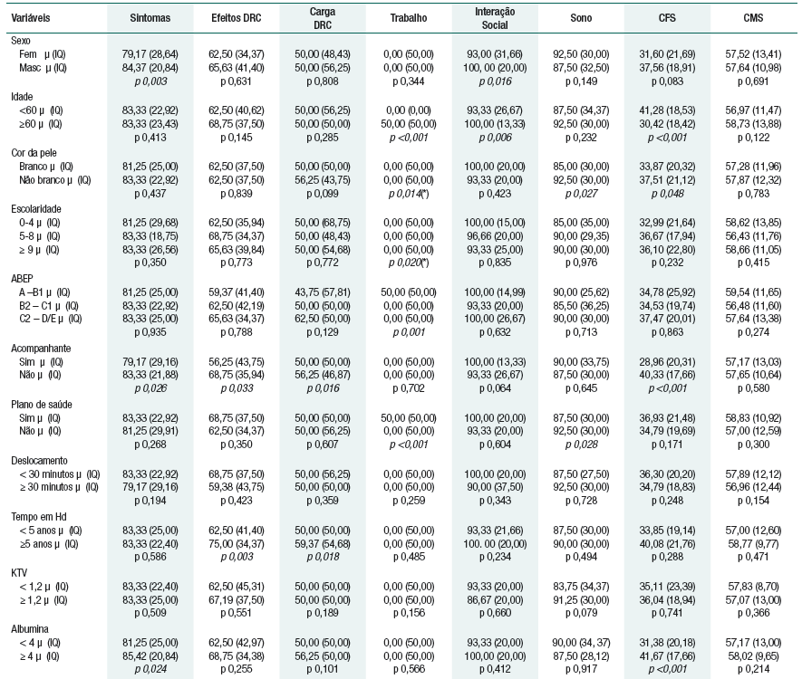 A tabela 3 apresenta a mediana, intervalo interquartil e a associação entre as variáveis relacionadas à QVRS e as dimensões específicas do KDQOL-SF, CFS e CMS. As dimensões função cognitiva, suporte social, encorajamento, função sexual e satisfação com o tratamento não tiveram associação estatisticamente significativa, dados não apresentados.