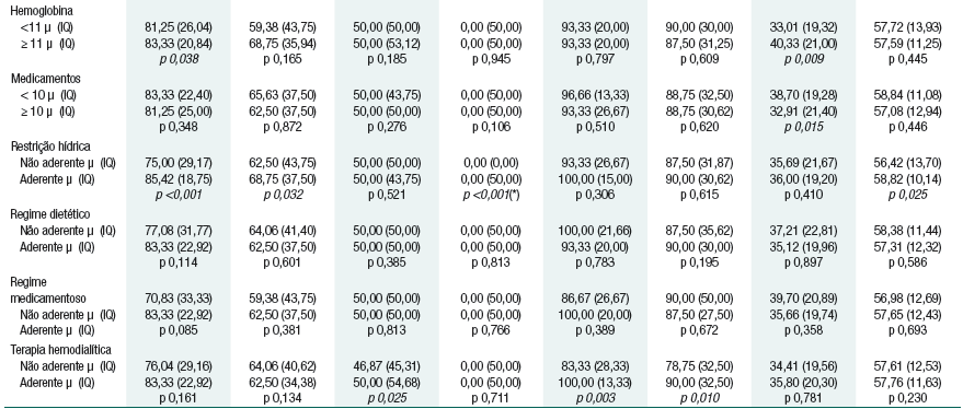 Destaca-se como aspecto relevante para a QVRS dos pacientes em hemodiálise a adesão ao esquema terapêutico: indivíduos classificados como aderentes à restrição hídrica apresentaram menos sintomas (p< 0,001), menor efeito da DRC (p= 0,032) e maior escore no CMS (p= 0,041). Já pacientes aderentes à terapia apresentaram menor carga da DRC (p= 0,025), maior interação social (p= 0,003) e melhor padrão de sono (p= 0,010). Aspectos relacionados à adesão aos regimes dietético e medicamentoso não apresentaram significância estatística (Tabela 3)