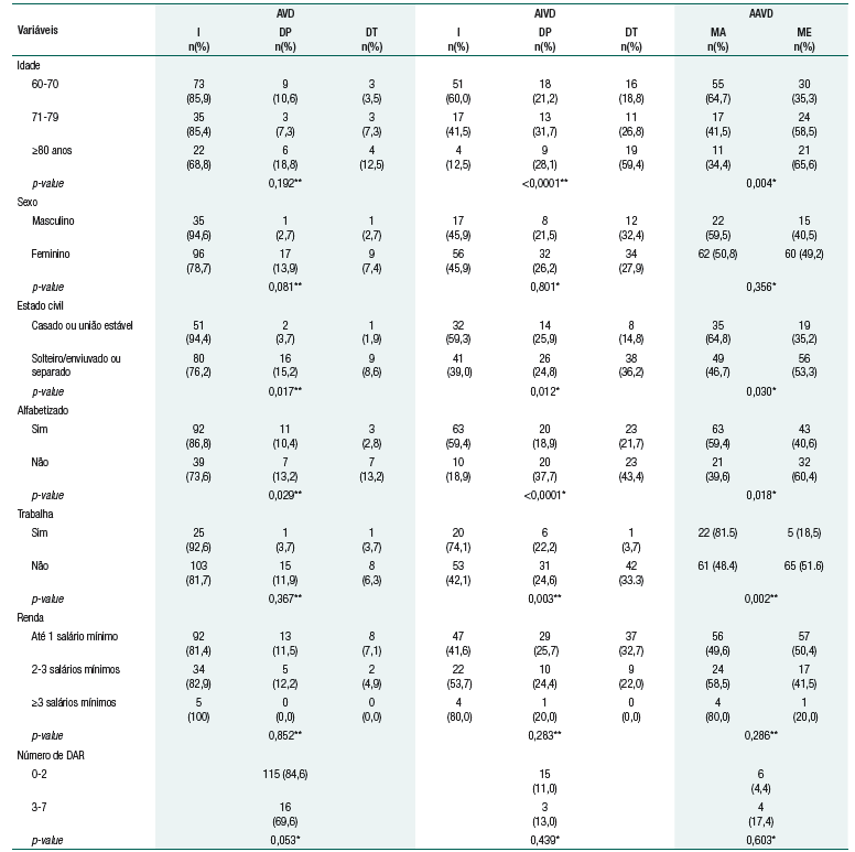 Ao analisar as faixas etárias, os idosos mais jovens (60-70 anos) foram maioria, o que corroborou os dados encontrados em um estudo com 820 idosos, em que 44,4% (n=250) estavam na faixa etária de 60 a 70 anos de idade.3 Essa faixa etária apresentou o maior nível de independência em todas as classificações de atividades, com significância estatística entre idade e AIVD e AAVD.