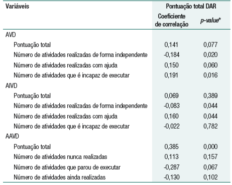 Os resultados da análise de correlação entre a pontuação total de DAR e o número de atividades em AVD, AIVD e AAVD demonstraram uma correlação positiva entre DAR e a pontuação total de AAVD (Tabela 2).
