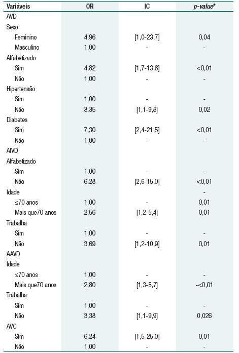As variáveis de avaliação da capacidade funcional para AVD e AIVD foram dicotomizadas em independência e dependência para realização da regressão múltipla ajustada. Apenas as variáveis que apresentaram p<0,2 nas análises bivariadas foram incluídas no modelo. As seguintes variáveis entraram no modelo para AVD: sexo, alfabetização, estado civil, se o entrevistado teve AVC, artrite, osteoporose, hipertensão, diabetes. As variáveis para as AIVD foram: idade, alfabetização, estado civil, trabalho, renda, se o entrevistado teve angina, acidente vascular cerebral, osteoporose. E as variáveis para AAVD foram: idade, alfabetização, estado civil, trabalho, renda, se o entrevistado teve AVC, osteoporose. Nos modelos de regressão múltipla, os fatores associados à capacidade funcional (OR ajustado) foram diferentes para AVD, AIVD e AAVD. Para a AVD, ter diabetes foi o fator mais importante, com 7.30 vezes mais probabilidade de ser dependente. Para AIVD e AAVD, não ser alfabetizado e ter sofrido acidente vascular cerebral, respectivamente, foram os fatores mais importantes (Tabela 3).