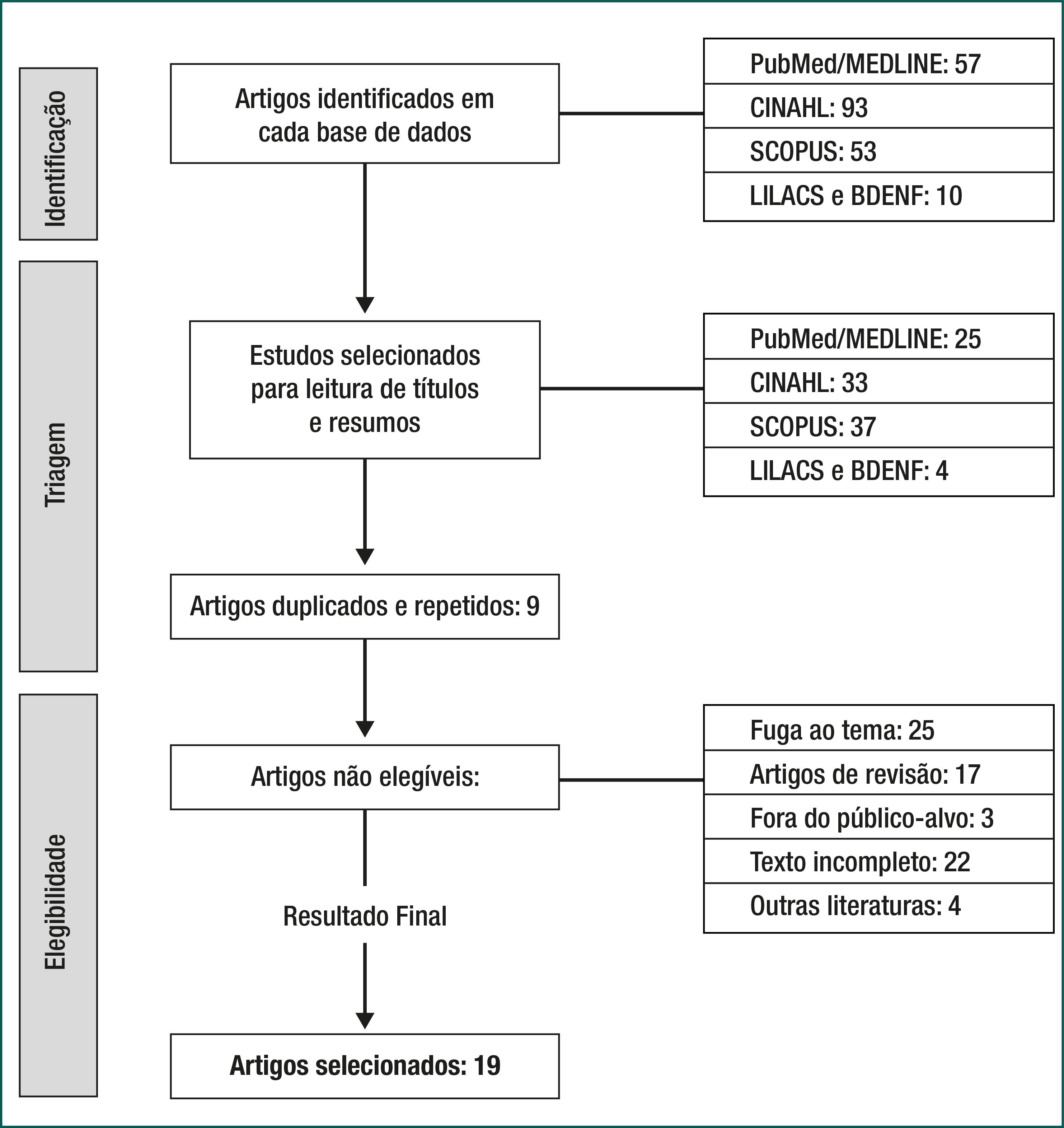 Diante da seleção das publicações, utilizou-se o gerenciador de referências “Endnote Web”, para armazenamento e organização dos estudos, bem como exclusão de artigos duplicados. Após as etapas de identificação, triagem e elegibilidade, a amostra ficou composta por 19 artigos. A figura 1 apresenta um fluxograma do processo de busca e seleção dos artigos por base de dados.