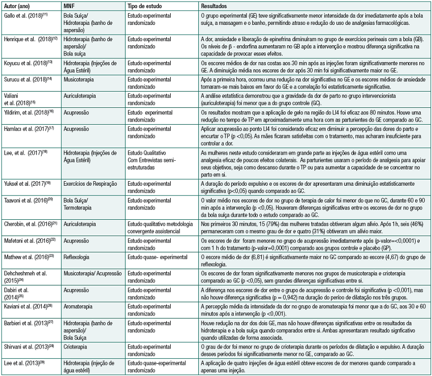 Diante do tipo de intervenção pesquisado, dividiram-se cinco categorias gerais: acupuntura e acupressão, terapias térmicas, hidroterapia, bola suíça e outros MNFs. Alguns estudos selecionados encaixam-se em mais de uma categoria, por isso, foi possível estabelecer comparações.