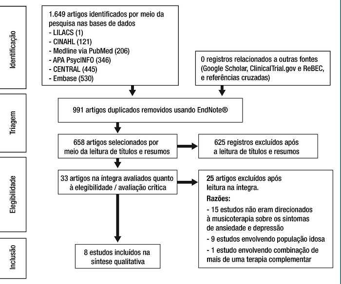 O levantamento nas bases de dados resultou em 1.649 estudos, e nenhum estudo adicional foi incluído após pesquisas no Google Scholar, bem como nos registros de ensaios clínicos e nas referências dos artigos primários selecionados. A triagem da busca revelou 991 duplicatas, resultando em 658 registros após a remoção das duplicações. A primeira triagem, baseada nos critérios de exclusão, bem como através da leitura de títulos e resumos, excluiu a maioria dos estudos (625). Após a elegibilidade/avaliação crítica dos textos completos de 33 registros, 8 registros atenderam a todos os critérios de inclusão e prosseguiram para a fase de extração de dados, leitura exaustiva e síntese qualitativa. A figura 1 apresenta um fluxograma do processo de busca de acordo com o fluxograma PRISMA.(20)