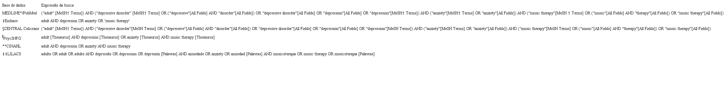 A busca pelos estudos foi realizada em nove de dezembro de 2019, nas seguintes bases de dados: Medical Literature Analysis and Retrieval System Online (MEDLINE) via PubMed, Embase (Excerpta Medica database), CENTRAL Cohcrane, Cumulative Index to Nursing and Allied Health Literature (CINAHL), Literatura Latino-Americana do Caribe em Ciências da Saúde (LILACS) e American Psychological Association (APA) PsycINFO. Não foram aplicados limites de temporalidade de publicação e nem de idioma.