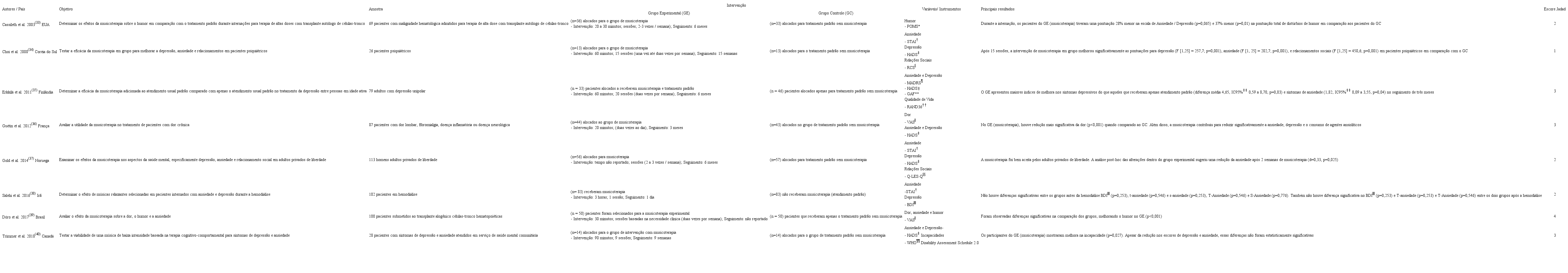 Por outro lado, um ECR realizado no Canadá com 28 participantes, que teve como objetivo testar a viabilidade de uma música de baixa intensidade baseada na terapia cognitivo-comportamental para depressão e ansiedade, mostrou que os participantes do grupo de musicoterapia, que receberam intervenção durante 9 semanas, não apresentaram diferenças estatísticas quando comparados aos participantes do grupo controle, que receberam cuidados padrão.(40)