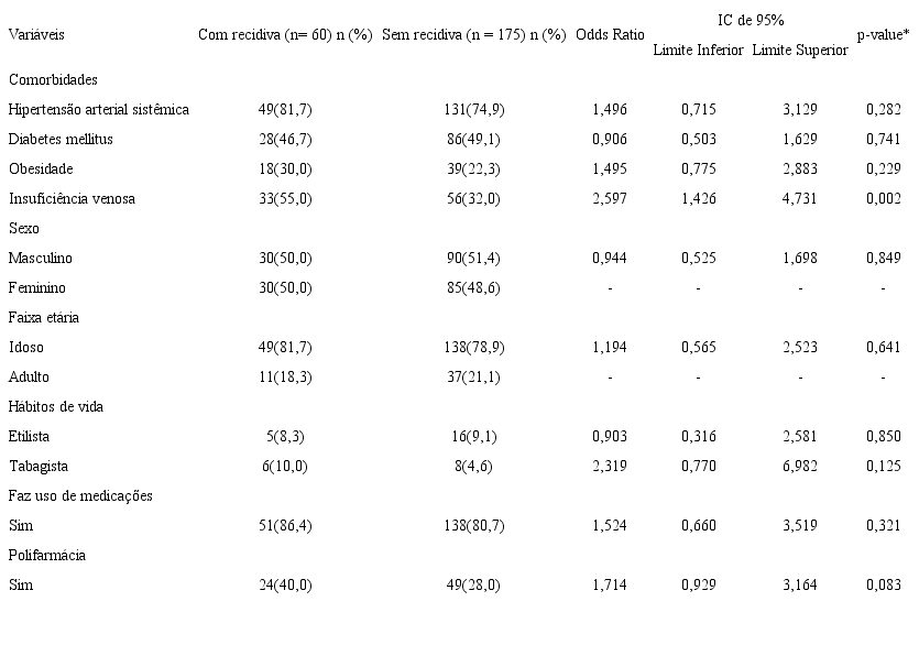 Resultados: A prevalência de recidiva de erisipela foi de 25,5% (n=60). Os fatores significativamente associados à recidiva foram insuficiência venosa (p= 0,002; OR= 2,597; IC= 1,4-4,7) e uso de penicilina (p< 0,000; OR= 7,042; IC= 2,5-19,7).