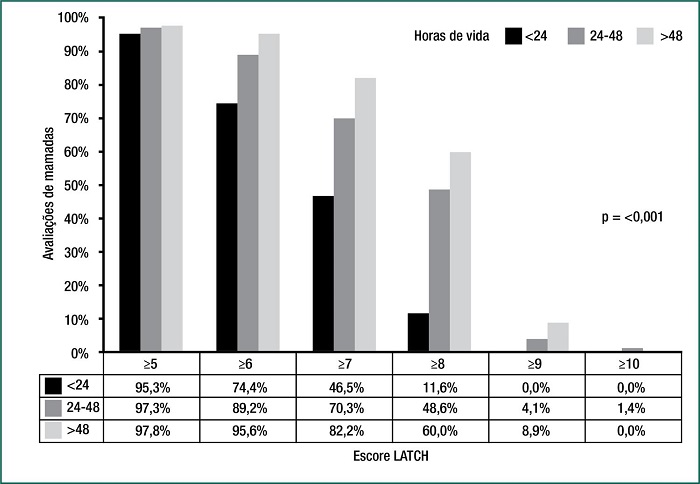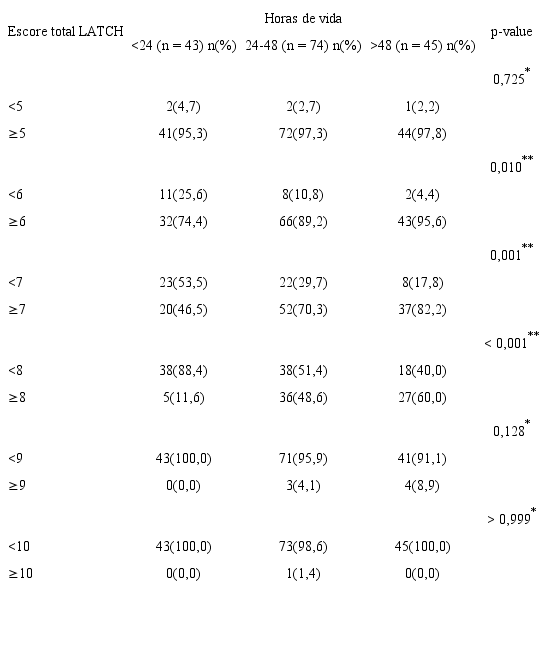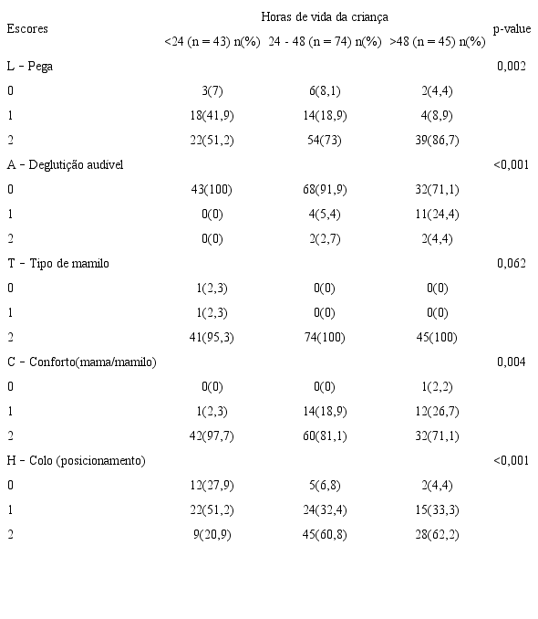 As dificuldades para amamentar foram apresentadas e analisadas de acordo com as horas de vida da criança (<24 horas, 24 a 48 horas e >48 horas), em relação aos escores individuais e total da escala LATCH.