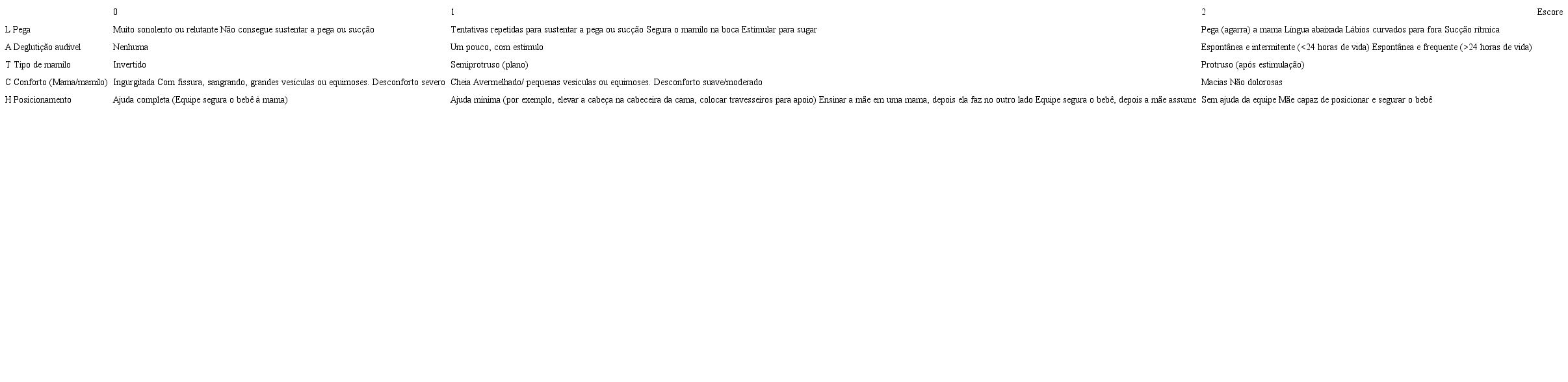 O sistema LATCH atribui uma pontuação numérica (0, 1 ou 2) a cinco componentes-chave da amamentação para uma pontuação total possível de 10 pontos. Sugere-se que a qualidade da pega do bebê deve ser avaliada duas vezes durante um período de 24 horas, por dois profissionais de saúde, e documentada.(2)