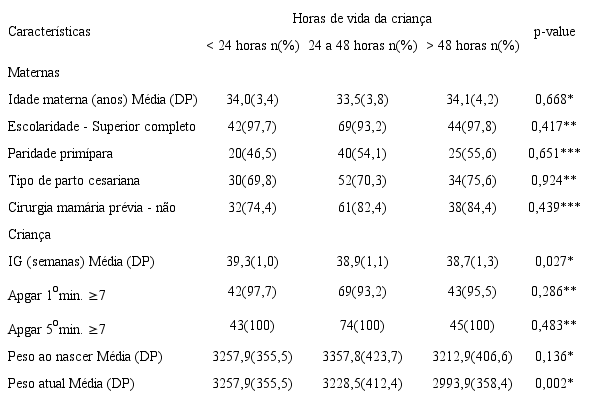 Os grupos de tempo de vida dos recém-nascidos foram comparados em relação às características maternas e dos recém-nascidos. Observaram-se diferenças nas médias de idade gestacional ao nascimento e no peso do dia da coleta, o grupo com menos de 24 horas de vida apresentou médias maiores do que o grupo com mais de 48 horas (Tabela 1).