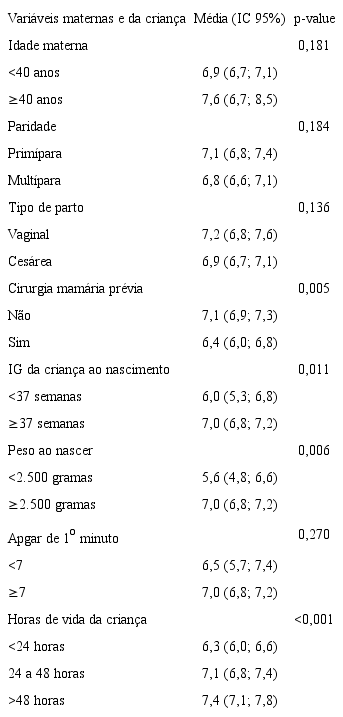 O escore total da escala LATCH foi menor para as mulheres com cirurgia mamária prévia (p=0,005), cujos filhos apresentavam <37 semanas (p=0,011), peso ao nascer menor de 2.500 gramas (p=0,006) e com <24 horas de vida (p<0,001). O baixo número de mulheres estudadas com cirurgia mamária não permitiu a comparação dessa variável (Tabela 4).