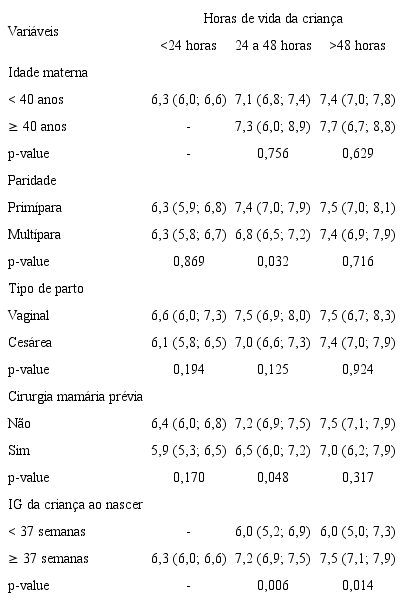 Os dados coletados foram transferidos para as planilhas de Excel. As variáveis categóricas foram descritas por frequência, e as numéricas, apresentadas como média, desvio padrão, valores mínimo e máximo. Consideraram-se como variáveis respostas deste estudo: idade materna (categorizada em: <39 anos e ≥40 anos), paridade (primípara ou multípara), tipo de parto (vaginal e cesariana), cirurgia mamária prévia (presença ou ausência), tipo de cirurgia mamária (aditiva, redutora ou retirada de nódulo), idade gestacional da criança (<37 ou ≥37 semanas), peso ao nascer (<2.500 ou ≥2.500 gramas), Apgar 1° minuto (<7 ou ≥7) e horas de vida da criança (<24 horas, 24-48 horas ou >48 horas). Os grupos de tempo de vida dos recém-nascidos foram comparados em relação às características maternas e dos recém-nascidos por meio de modelos de análise de variância (ANOVA) ou testes não paramétricos de Kruskal-Wallis e as diferenças localizadas por testes de comparações múltiplas com os valores p corrigidos pelo método de Bonferroni para variáveis numéricas e testes Qui-quadrado ou exatos de Fisher para variáveis categóricas.