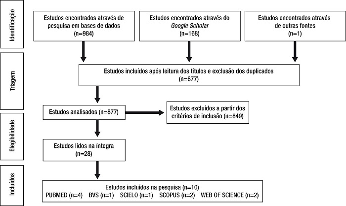 Encontraram-se inicialmente 1.153 estudos, a partir das buscas em base de dados e literatura cinzenta. Desses, 849 não atendiam aos critérios de elegibilidade. Ao final da seleção, totalizaram dez artigos incluídos na amostra conforme apresentado na figura 1.