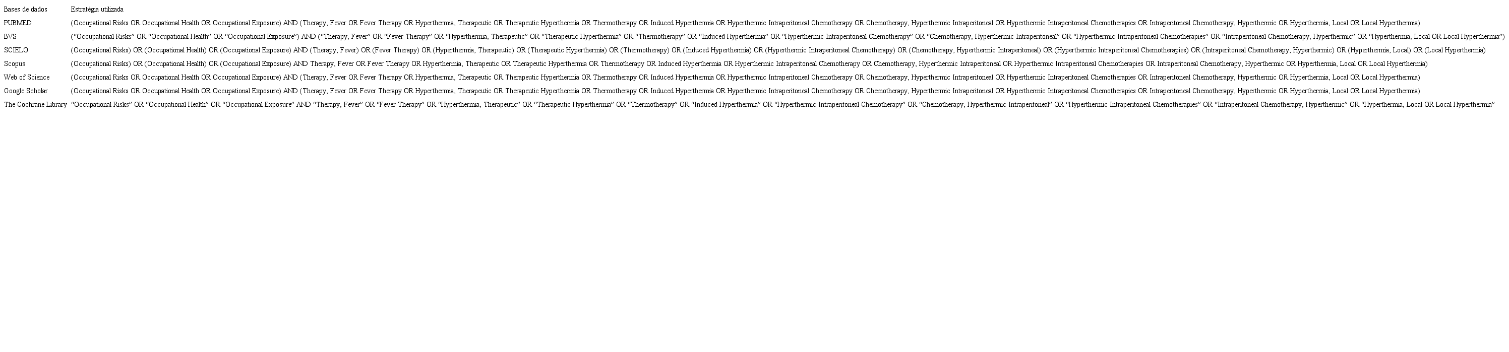 Seleção dos termos controlados no Descritores em Ciências da Saúde (DeCS) e Medical Subject Headings (MeSH) acrescentados de termos não controlados. Selecionados no DeCS: hipertermia induzida, centro cirúrgico, tratamento farmacológico, saúde do trabalhador e neoplasias peritoneais. No MeSH: induced hyperthermia, surgicenters, drug therapy, occupational health e peritoneal neoplasms. Estratégia de busca definida com operadores booleanos AND e OR, combinados a termos não controlados relacionados à HIPEC e segurança ocupacional. Quadro um apresenta bases de dados com suas respectivas estratégias de busca (Quadro 1).