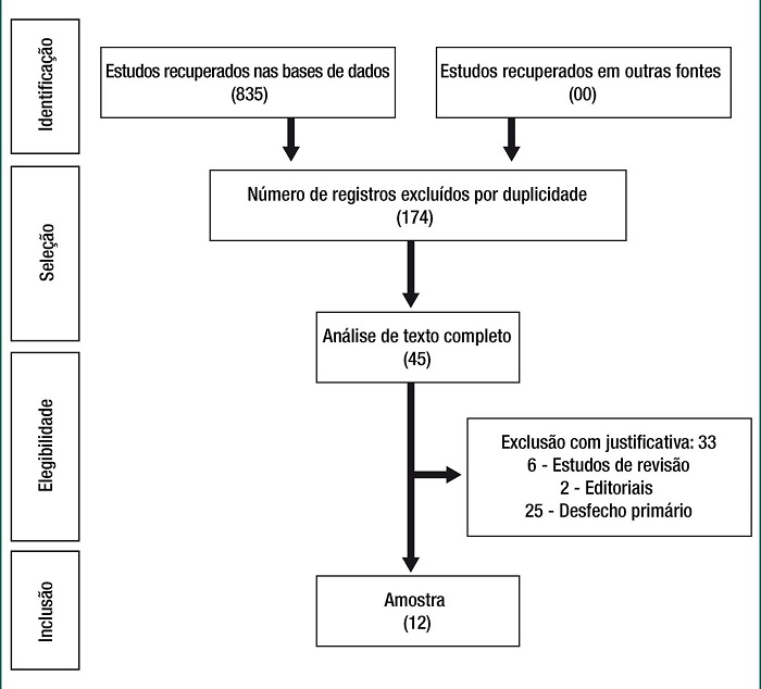 Foram recuperadas 835 produções e após a aplicação dos critérios de elegibilidade, obteve-se a composição da amostra, sendo formada por 12 estudos. O percurso realizado para identificação, seleção, elegibilidade, inclusão e amostra seguiu as recomendações do Preferred Reporting Items for Systematic Reviews and Meta-Analyses (PRISMA),(16) conforme apresentado na figura 1.
