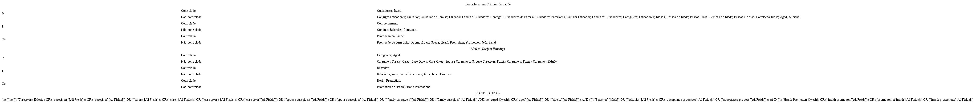 A questão de pesquisa foi estruturada considerando os domínios da estratégia PICo. A População (P) refere-se ao cuidadores informais de idosos; o Fenômeno de Interesse (I), aos comportamentos; e o Contexto (Co) à promoção da saúde.(15) Desse modo, este estudo foi conduzido pela seguinte questão: Quais as evidências científicas relacionadas aos comportamentos promotores de saúde adotados por cuidadores informais de pessoas idosas?