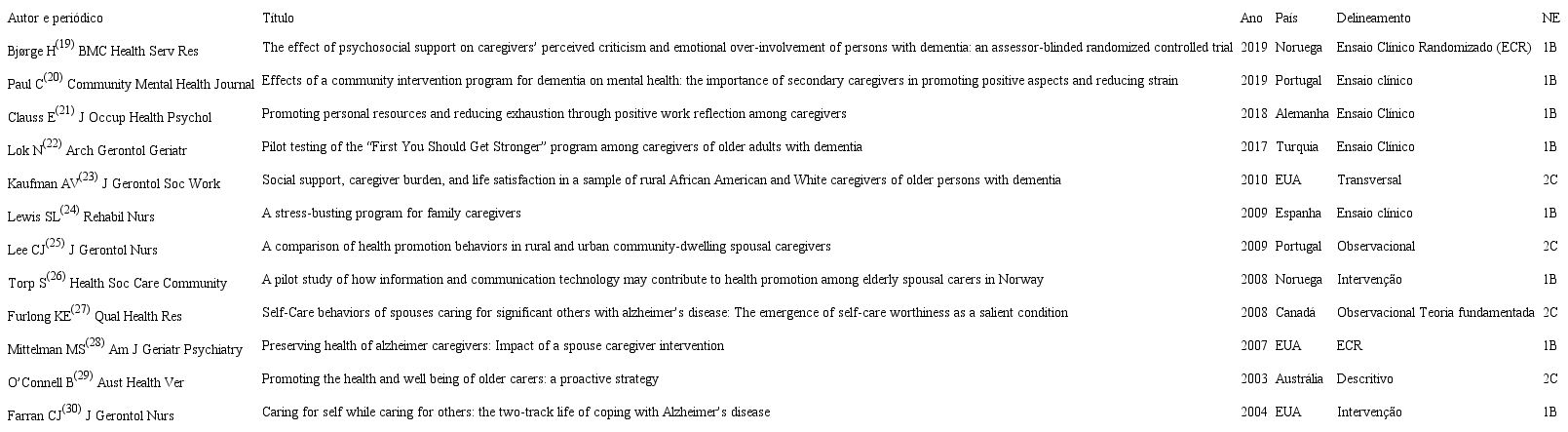 A análise descritiva dos resultados mostrou que a busca pela promoção e adesão aos comportamentos promotores de saúde entre cuidadores de idosos é alvo constante de investigações científicas em múltiplos contextos do cenário nacional e internacional. Nesse sentido, verificou-se que os estudos, em sua totalidade, foram publicados em idioma inglês e desenvolvidos em diferentes países como Estados Unidos da América (EUA), Noruega e Portugal que se destacaram por concentrar o maior número de investigações. O crescente interesse de pesquisadores pelo tema foi evidenciado, mostrando a necessidade de suporte e apoio como fator protetor e indutor do bem-estar físico, mental e social e da qualidade de vida dos cuidadores, assim como indicador para redução do risco de comorbidades psicopatológicas nesse segmento populacional. Nesse sentido, verificou-se o predomínio de estudos publicados entre os anos de 2003 a 2019. Em relação ao delineamento metodológico, prevaleceram ensaios clínicos, nível de evidência 1B, voltados para a avaliação do impacto de intervenções no desenvolvimento e na adesão do autocuidado e dos comportamentos promotores da saúde e da qualidade de vida. O quadro 2 apresenta a caracterização dos resultados incluídos (n=12) conforme autor principal e periódico, título do estudo, ano de publicação, país em que a produção foi desenvolvida, delineamento metodológico e nível de evidência (NE).