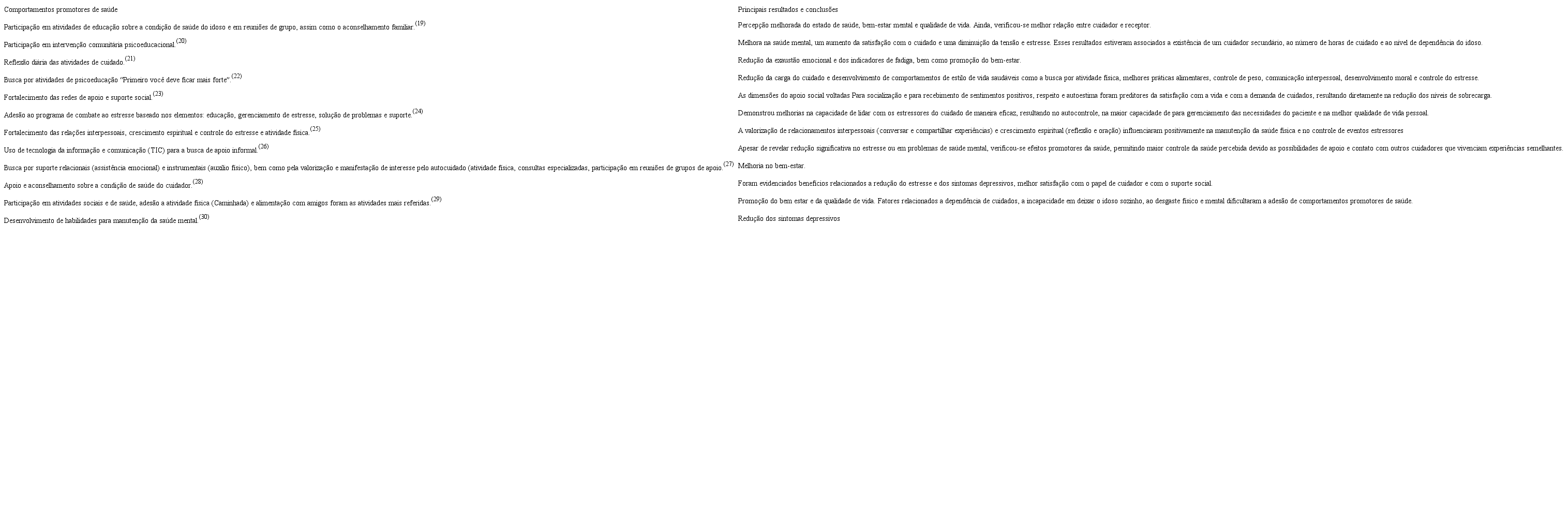 Nesse contexto, os comportamentos promotores de saúde identificados compreenderam ações sistematizadas desenvolvidas pelos cuidadores e apresentaram desfechos positivos e duradouros para a manutenção do funcionamento físico, da qualidade de vida e do seu bem-estar.(19,27,29)