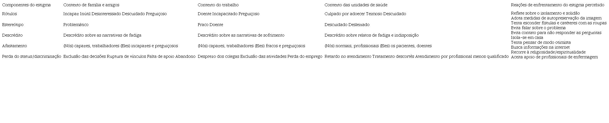 Conclusão: A estigmatização cria barreiras para a sociabilidade, acesso a bens e serviços de saúde e seguridade social, e repercute sobre a imagem corporal, adaptação e enfrentamento do adoecimento crônico.