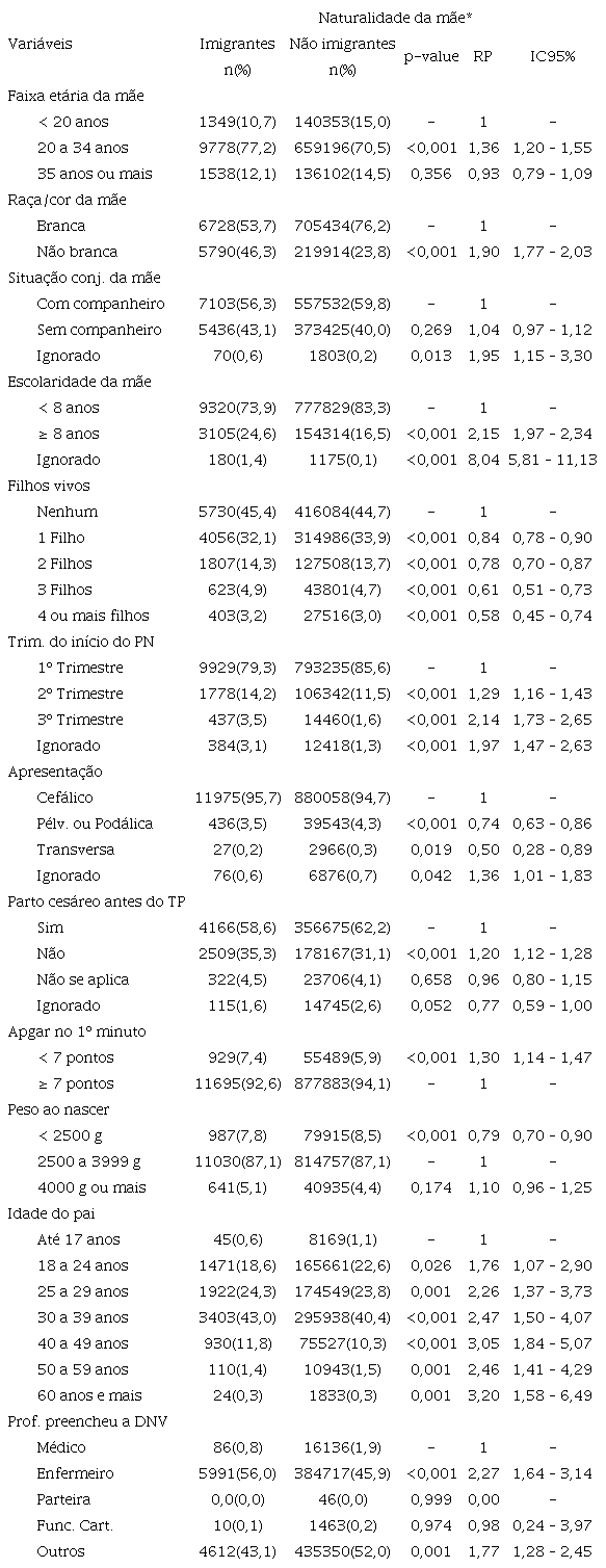 Resultados: De los 948.316 nacimientos, 12.665 (1,33 %) eran hijos de inmigrantes. Los factores asociados al nacimiento de hijos de inmigrantes fueron: edad de la madre entre 20 y 34 años (RP:1,36; IC:1,20-1,55), raza/color no blanco (RP:1,90; IC:1,77-2,03), mayor escolaridad (RP:2,15; IC:1,97-2,34), cuatro hijos vivos (RP: 0,58; IC: 0,45-0,74). Las características perinatales asociadas fueron: comienzo tardío del control prenatal, en el segundo trimestre (RP:1,29; IC:1,16-1,43) y en el tercer trimestre (RP:2,14; IC:1,73-2,65), presentación pélvica o podálica (RP: 0,74; IC: 0,63-0,86), Apgar <7 en el primer minuto (RP:1,30; IC:1,14-1,47), ausencia de parto por cesárea anterior (RP:1,20; IC:1,12-1,28); y bajo peso al nacer (RP:0,79; IC:0,70-0,90). También se demostró asociación con los factores: edad del padre, responsable de completar la declaración y la categoría de datos ignorados en distintas variables.
