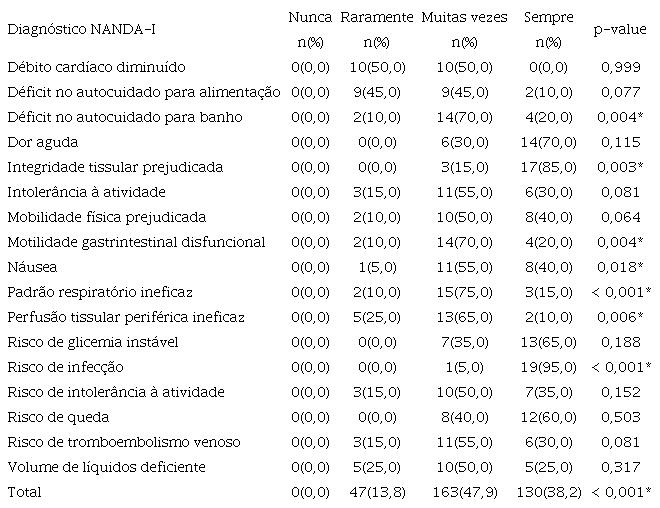 Os juízes indicaram com significância estatística os seguintes diagnósticos: déficit no autocuidado para banho, integridade tissular prejudicada, motilidade gastrintestinal disfuncional, náusea, padrão respiratório ineficaz, perfusão tissular periférica ineficaz e risco de infecção. Assim, os diagnósticos de risco de infecção (95,0%) e integridade tissular prejudicada (85,0%) obtiveram maiores prevalências para a resposta “sempre”, enquanto os diagnósticos de padrão respiratório ineficaz (75,0%), déficit no autocuidado para banho (70,0%), motilidade gastrintestinal disfuncional (70,0%) e perfusão tissular periférica ineficaz (65,0%) alcançaram maiores prevalências para a resposta “muitas vezes”. Na avaliação do diagnóstico náusea houve semelhança para as categorias de respostas “muitas vezes” (55,0%) e “sempre” (40,0%), e o mesmo aconteceu na avaliação do total de respostas (muitas vezes: 47,9% e sempre: 38,2%). Todos os casos foram considerados claros e representativos de situações reais de pacientes no pós-operatório imediato e mediato para minimamente 95% dos juízes. Todos os valores calculados no intervalo de confiança da proporção superaram o valor mínimo convencionado de 70% (0.70). Os valores obtidos e calculados são detalhados na tabela 3 .