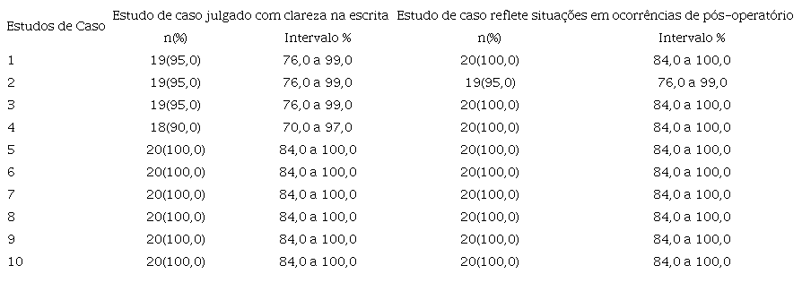 Para avaliação da tecnologia instrucional participaram 20 juízes enfermeiros com experiência na assistência ao paciente em cirurgia bariátrica e na utilização da taxonomia NANDA-I e intervenções de enfermagem da NIC na sua prática clínica. Características, estas, fundamentais e suficientes para assegurar maior acurácia durante a avaliação do instrumento.( 23 , 24 ) Portanto, seu julgamento coletivo confere um grau satisfatório de aceitação do valor de conteúdo dos estudos de caso elaborados.
