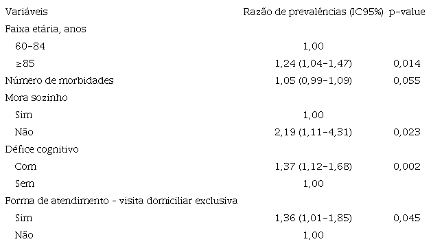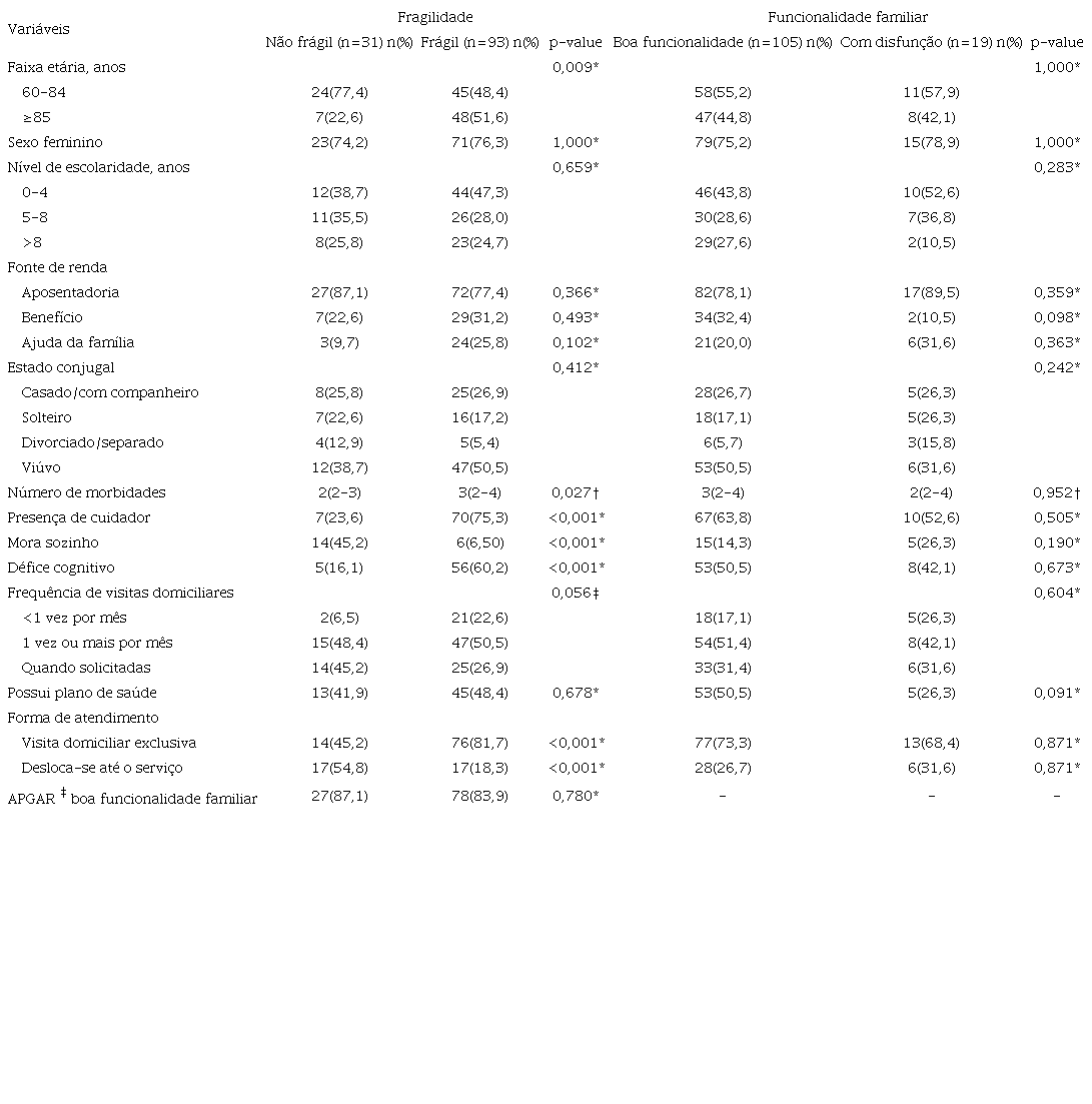 Houve predomínio de idosos frágeis, representando 75% da amostra. Quanto à funcionalidade familiar, a maior parte (cerca de 85%) apresentou boa funcionalidade. Conforme a tabela 1 , houve associação estatisticamente significativa entre as seguintes variáveis com a fragilidade: faixa etária de 85 anos ou mais, presença de cuidador, não morar sozinho, receber visita domiciliar exclusiva como forma de atendimento e apresentar défice cognitivo.
