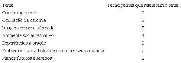 Sete temas emergiram da análise dos dados: constrangimento; ocultação da ostomia; imagem corporal alterada; ambiente social restritivo; experiências à oração; problemas vivenciados com bolsa de ostomia e seus cuidados; e mudança de planos futuros. A distribuição dos temas e a contagem de participantes são apresentadas no Quadro 2 .