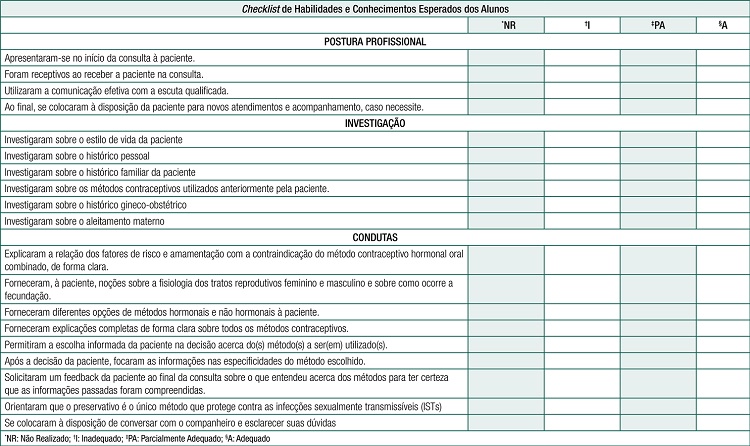 No eixo “Conduta” foi substituído o item “Forneceram diferentes opções de métodos não hormonais à paciente” por “Forneceram diferentes opções de métodos hormonais e não hormonais à paciente”, pois é direito da paciente receber informações claras e completas de todos os métodos contraceptivos disponibilizados pelo Ministério da Saúde, para assim garantir uma escolha livre e informada por parte da paciente. Assim como acrescentaram-se os itens “Forneceram explicações completas de forma clara sobre todos os métodos contraceptivos” e “Após a decisão da paciente, focaram as informações nas especificidades do método escolhido”. Também foi acrescentado o item “Se colocaram à disposição de conversar com o companheiro e esclarecer suas dúvidas” visto que a responsabilidade de planejar/prevenir uma gestação não é só da mulher, mas sim do casal, sendo também o direito do companheiro estar ciente e informado sobre os métodos contraceptivos disponíveis.