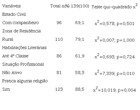 Um total de 79,86% dos participantes eram do sexo feminino com idades compreendidas entre os 26 e os 85 anos e uma média de idades de 63,05 anos. Na tabela 1 , caracterizamos as pessoas com AR acompanhadas na consulta de reumatologia de uma unidade hospitalar da zona norte de Portugal, de forma sucinta, evidenciando o n amostral mais elevado de cada categoria.
