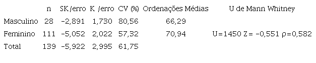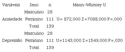 Na ansiedade, observou-se mínimo de 3, máximo de 21 e valor médio de 14,482 (DP=4,386). A depressão variou entre zero e 21, com valor médio de 5,475 (DP=4,318). Verificou-se também que na dimensão ansiedade os homens apresentam valores médios mais elevados face às mulheres com diferenças estatísticas bastante significativas (U=872; p=0,00), contrariamente à dimensão depressão, com diferenças estatisticamente significativas (U=1143; p=0,030) ( Tabela 3 ).