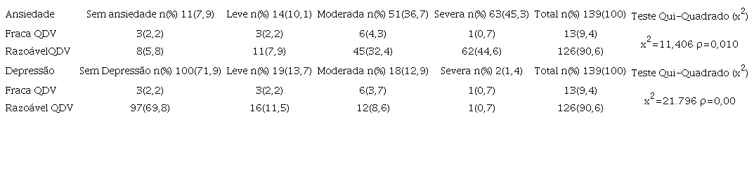 Resultados: Os achados sobre o estado emocional mostraram níveis de ansiedade severos em 45,3%, ansiedade moderada em 36,7%, ansiedade leve em 10,1% e apenas 7,9% dos participantes pontuaram sem ansiedade. A maioria não apresenta sintomatologia depressiva (71,9%) e 13,7% manifestou depressão leve. Os baixos níveis de depressão foram associados a uma melhor qualidade-de-vida, contrariamente aos níveis de ansiedade, onde uma diminuição dos mesmos diminui a qualidade-de-vida (p=0,000).
