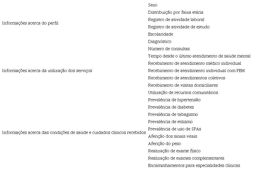 Os dados foram levantados como parte de um diagnóstico situacional da rede de serviços por meio da coleta em prontuários. Os procedimentos de coleta foram realizados nos próprios serviços estudados por 16 coletadores previamente treinados entre maio e julho de 2019. Esses indivíduos eram estudantes de graduação ou profissionais graduados dos cursos de psicologia ou medicina supervisionados por dois profissionais graduados, um em enfermagem e o outro em serviço social.