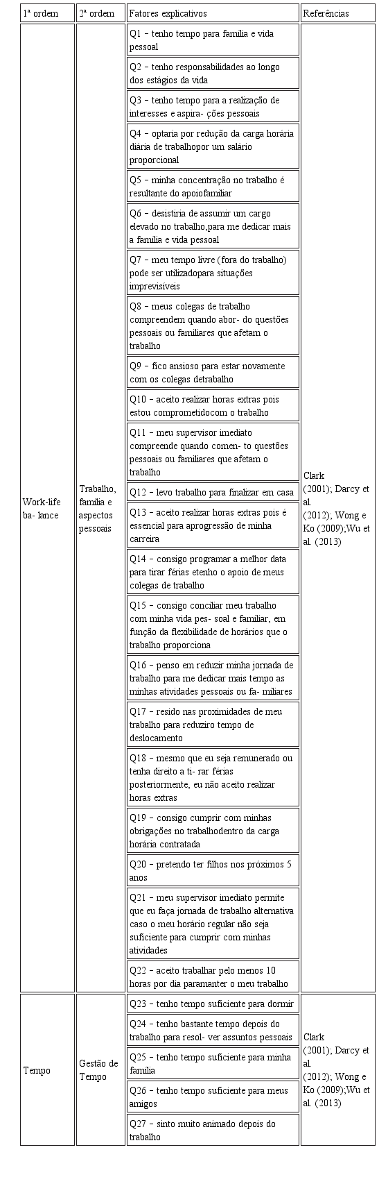 A partir da questão norteadora desta investigação, verifica-se a necessidade de identificar os constructos da pesquisa. O termo work-life balance definido como constructo de 1ª ordem, em conformidade com a definição de Khallash e Kruse (2012) busca a integração dos anseios individuais a partir da interação dos domínios trabalho e família, de modo que as pressões externas ao trabalho sejam gerenciadas. Neste sentido definiu- se trabalho, família e aspectos pessoais como constructos de 2ª ordem. Em função da relação do work-life balance com o tempo, adicionalmente considerou a gestão de tempo também como constructo de 2ª ordem, Quadro 1.