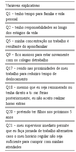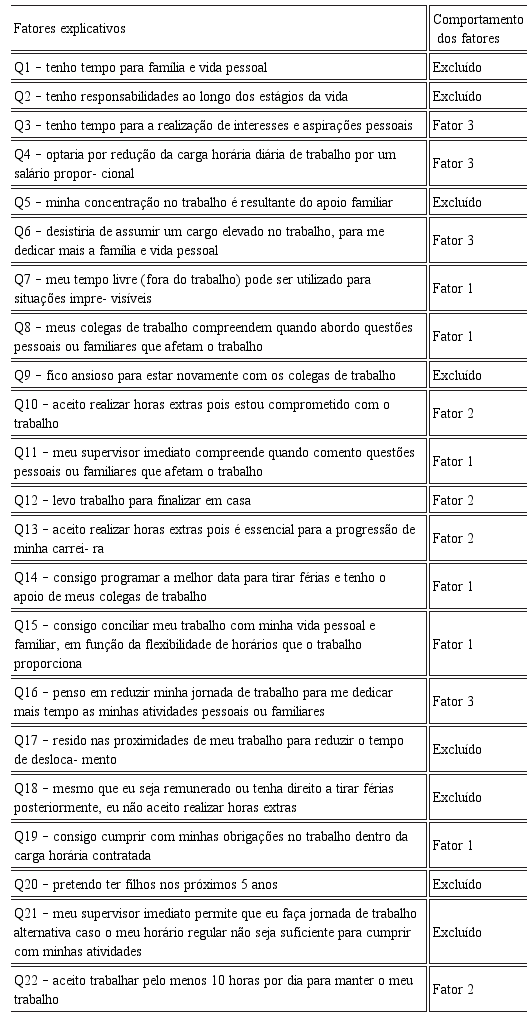 Após a extração dos 3 fatores de work-life balance através da análise de componentes principais (ACP) e da rotação ortogonal(Varimax), algumas variáveis explicativas de work-life balance foram desconsideradas.A análise dos dados ressalta que a exclusão destas 8 variáveis contribuíram para melhora dos resultados da AF, conforme explicação a seguir, Tabela 1.