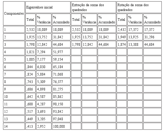 Pela Tabela 3 é possível verificar o comportamento das variáveis após a AF. As questões 1, 2, 5, 9, 17, 18, 20 e 21 foram eliminadas pela rotação Varimax. Portanto, das 22 variáveis iniciais 8 foram desconsideradas, o que resultou em 14 variáveis alocadas a 3 fatores.