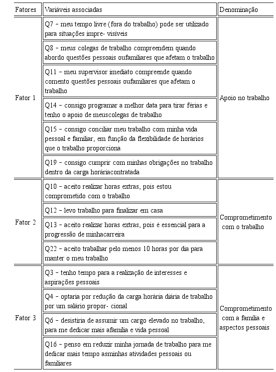 Logo, para reduzir possíveis dúvidas quanto a alocação das variáveis aos fatores, tendo em vista a existência de variáveis com poder de explicação muito próximos, confirma-se a composição dos fatores após a aplicação da rotação Varimax (BEZERRA, 2009).Assim, após a rotação Varimax, as variáveis foram associadas aos fatores de work- life balance. Nesta ótica, constatou-se a existência de 3 fatores de work-life balance, compostos por variáveis, conforme retrata a Tabela 2.