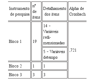 Adicionalmente, a confiabilidade do instrumento de pesquisa foi reaplicada, após exclusão das 8 variáveis já mencionadas. Constatou-se que a confiabilidade do instrumento de pesquisa permaneceu inalterada, com Alpha de Cronbach de 0,721 antes e após a redução de variáveis, Tabela 4.