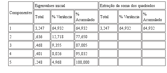O KMO de 0,568 apresentou adequabilidade amostral boa, além disso o teste de esfericidade de Barlett’ com p-value de 0,000 evidenciou que as variáveis estão correlacionadas, sendo assim, recomenda-se que a técnica de AF seja utilizada