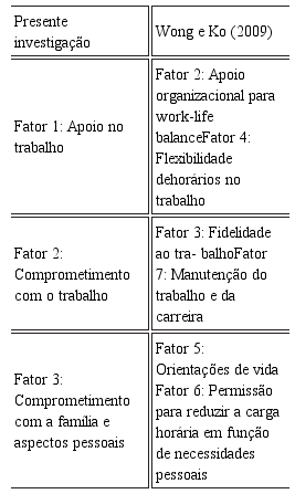 Quanto a aplicação da AF, os achados da presente investigação de certa forma são similares ao estudo de Wong e Ko (2009) com algumas ressalvas. Neste estudo foram 3 os fatores identificados como explicativos do work-life balance de contadores. Por outro lado Wong e Ko (2009) encontraram 7 fatores explicativos de work-life balance após a utilização da técnica de AF, (1) tempo fora do trabalho; (2) apoio organizacional para work-life balance; (3) fidelidade ao trabalho; (4) flexibilidade de horários no trabalho; (5) orientação de vida; (6) permissão para reduzir a carga horária em função de necessidades pessoais e (7) manutenção do trabalho e da carreira.
