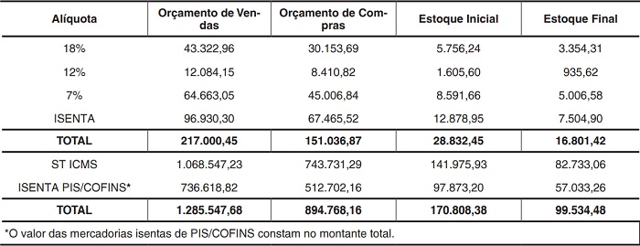 Para a composição do orçamento de vendas e compras buscou-se as melhores previsões (Tabela 6) e subdividiu-se a receita bruta de vendas e as compras estimadas pelo modelo, de acordo com o percentual de ICMS dos dados coletados. Desta forma, a Receita Bruta, as compras e os estoques foram separadas nas alíquotas Isenta, 7%, 12%, 18%, Substituição Tributária de ICMS e Isentas de PIS/COFINS, como pode ser visto na Tabela 8,a seguir: