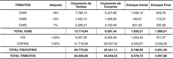 Após a separação dos valores estimados de compras, vendas e estoques por alíquotas e tipos de tributos, a Tabela 9 apresenta a previsão do montante de tributos que incidem sobre esses valores.