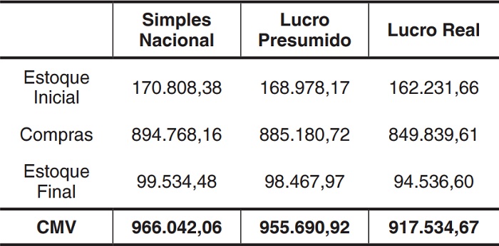 O cálculo do CMV, como visto na Tabela 10, difere de uma forma de tributação para outra, devido ao fato de que os valores utilizados já se encontram líquidos dos impostos. No caso do Simples Nacional, não há o aproveitamento de impostos, no Lucro Presumido aproveitou-se apenas o ICMS e no Lucro Real o ICMS, o PIS e a COFINS.