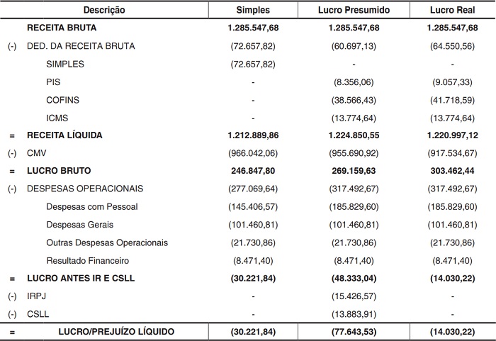 Neste caso, a Tabela 13 mostra que, se a empresa optar pela forma de tributação do Simples Nacional, ela obterá um prejuízo de aproximadamente R$ 30.221,84. Para o Lucro Presumido haveria um prejuízo líquido de R$ 77.643,53 e no Lucro Real de R$ 14.030,22.