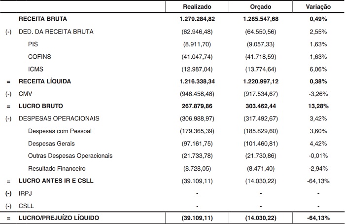 Como pode ser observado na Tabela 14, a empresa já vem obtendo um prejuízo ao longo do ano anterior. Os valores previstos se aproximam do ano de 2014, o que comprova o poder de previsão do modelo integrado. A variação entre os anos oscila entre -3,26% e 6,06%, sendo que o planejamento permitiu observar uma redução de cerca de 64,13% do prejuízo obtido no ano anterior.