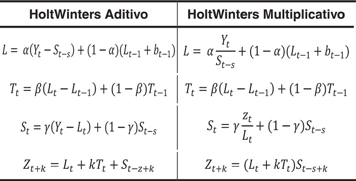 A modelagem matemática difere para cada modelo. As fórmulas do HoltWinters Multiplicativo e Aditivo são apresentadas na Tabela 1 a seguir: