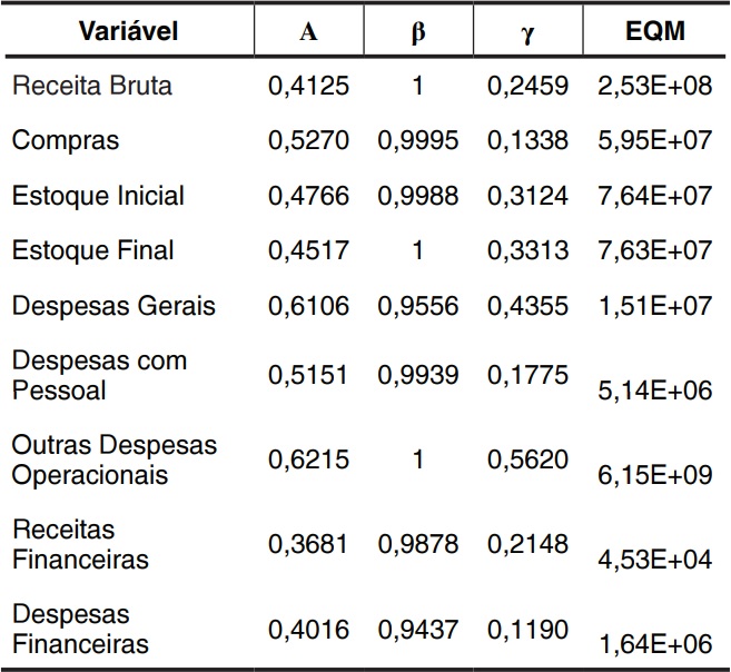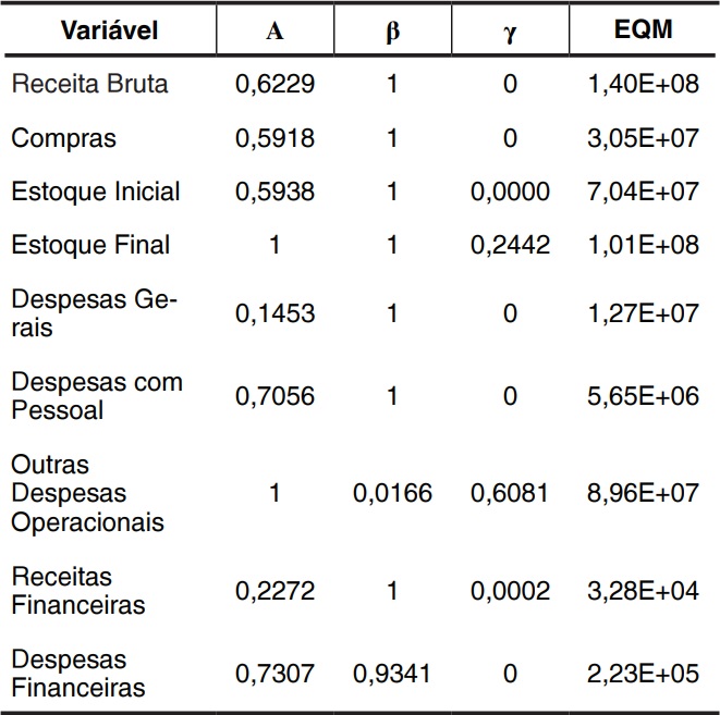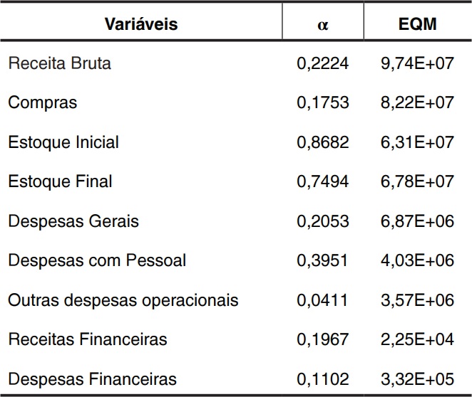 Como pode ser observado, a constante α varia de 0,11 a 0,86. Dentre as variáveis destaca-se aquela que possui maior EQM, a “Receita Bruta”, sendo seguida pela variável “Compras”. Isso ocorre devi- do a grande variabilidade destas variáveis durante os anos analisados, justificada pela sazonalidade. Já a variável com menor EQM é a de “Receitas Financeiras”.