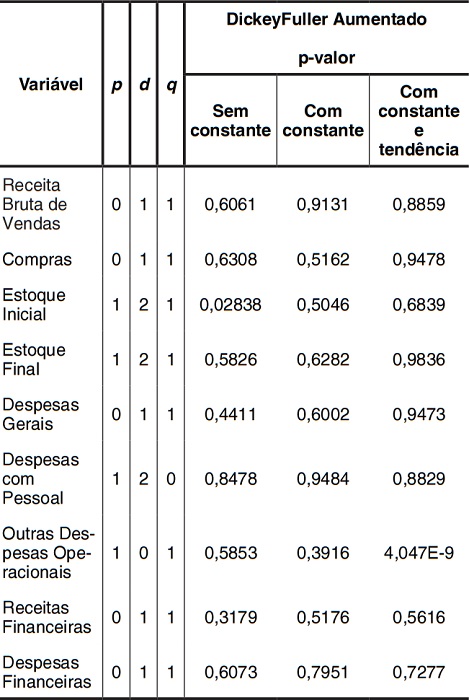 Os resultados anteriores, apresentados para o teste de DickeyFuller, representam os valores após a devida diferenciação das variáveis a fim de torná-las estacionárias. Dessa forma todas as variáveis, com exceção do “Estoque Inicial” e “Despesas Operacionais”, apresentaram p-valor acima do nível de significância de 5%, o que indica que, para alcançar a estacionariedade dos dados, é necessário realizar a diferenciação das variáveis.