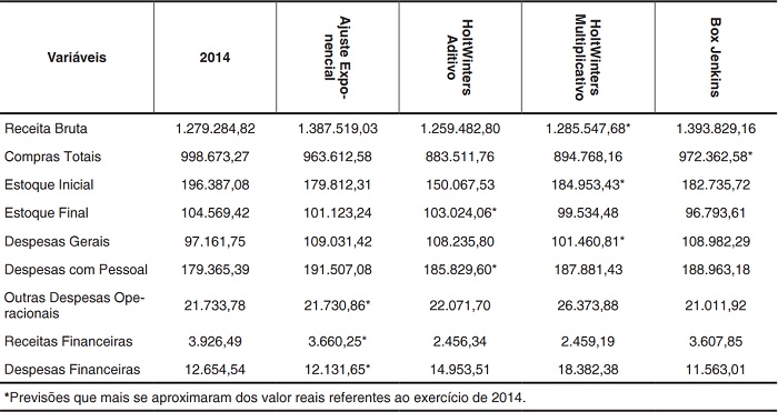 Os modelos de previsão foram aplicados tendo como base as séries temporais mensais de cada variável, coletadas entre janeiro de 2007 e dezembro de 2014 e comparados com os valores reais obtidos no ano de 2014, de tal forma que se pudesse construir um modelo de previsão de resultado que mais se aproxime da realidade. Os valores previstos podem ser observados na Tabela 6.